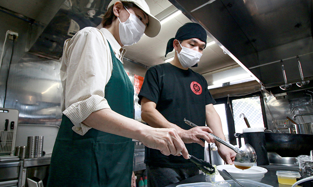 オープン時は忙しく時間配分が大変だったそうですが、現在は仕事にも慣れ、日々の業務はルーティン化。「6時起床で1日が始まりますが、時間配分が正確に出来るようになったので全く苦を感じることはありません」。営業時間は11時半から途中休憩を挟み、20時半まで。しかし、早めに終わる日が多々あるそうです。晴れる屋さんが提供しているのは青竹手打ちらーめん。その日提供する麺の数を決めてつくっているので、無くなり次第、終了になります。「麺を打つのは、決して楽ではないですが、今は毎日が楽しいですね。でも無理はしたくないので、数を決めて営業しています。おかげさまで希望の売上額を達成しているので、早めの閉店も可能になっています」。お店の掃除や片付けが終わった後は速やかに帰宅。中学生になるお子さんと食べる夕ご飯の時間を楽しみにしているそうです。