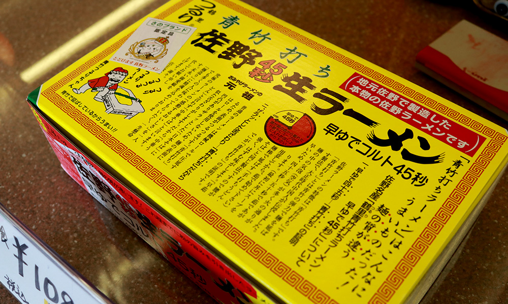 土産用のラーメンで一番苦労をした点を伺うと、いかに「日持ち」させるかだと教えてくれました。一般的なロール機械製麺で作られた麺は、水分が30%前後。「青竹打ち」の麺は水分45%〜50%もあります。多加水の麺は美味しいのですが、日持ちはしません。お土産としては不向き、どうやったら日持ちできるのか、そこには相当な苦労があったそうです。苦労の末、やっとお土産として販売できるラーメンが完成した頃、さらに追い風が吹きます。それが「佐野らーめん」ブームです。認知度が高まり、高速道路の売店やゴルフ場の売店など、佐野を訪れたお客様がお土産として購入。「青竹打ち」の美味しさ、最後の一滴まで飲み干したくなるスープに感動し、リピーターが続出しました。一目見ただけで忘れられないお土産用のパッケージ。ぎっしり書かれたラーメンの情報、インパクトのある色味、全て会長が手がけています。
